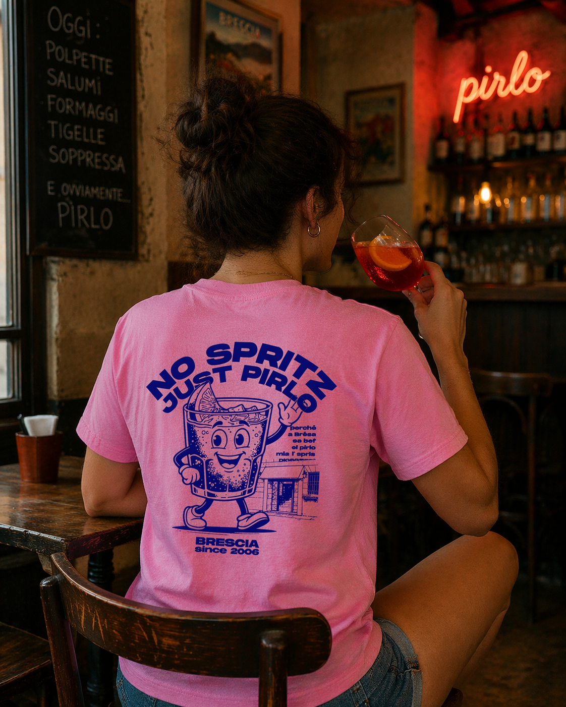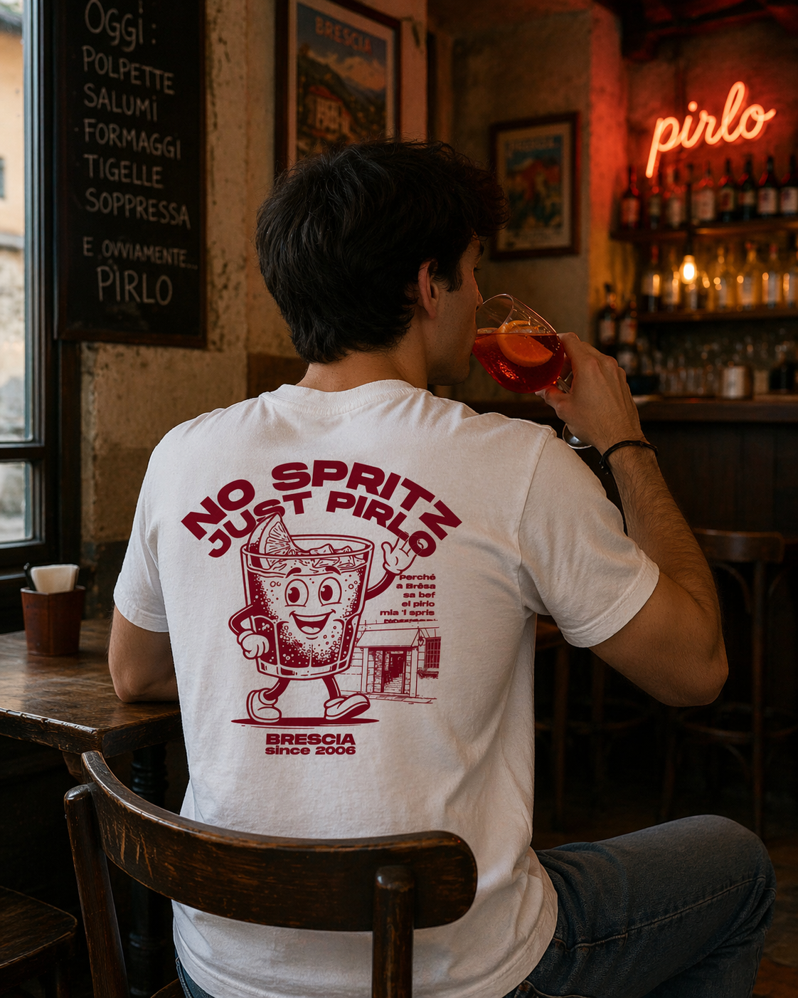 Ricamo lato cuore e stampa digitale DTF sul retro “NO SPRITZ JUST PIRLO”.